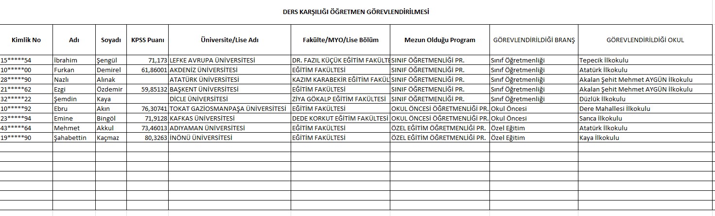 2025 - 2026 Eğitim Öğretim yılı I. dönem ders ücreti karşılığıı öğretmen görevlendirme 1. inha listesi açıklanmıştır.